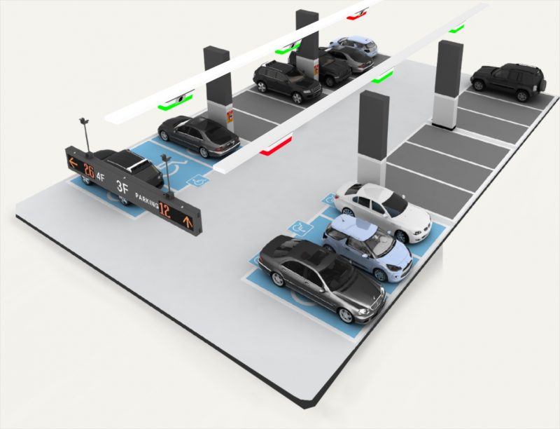 Space Guidance & Detection: Overhead or in-ground sensors with LED indicators (red/green) and central digital display boards.